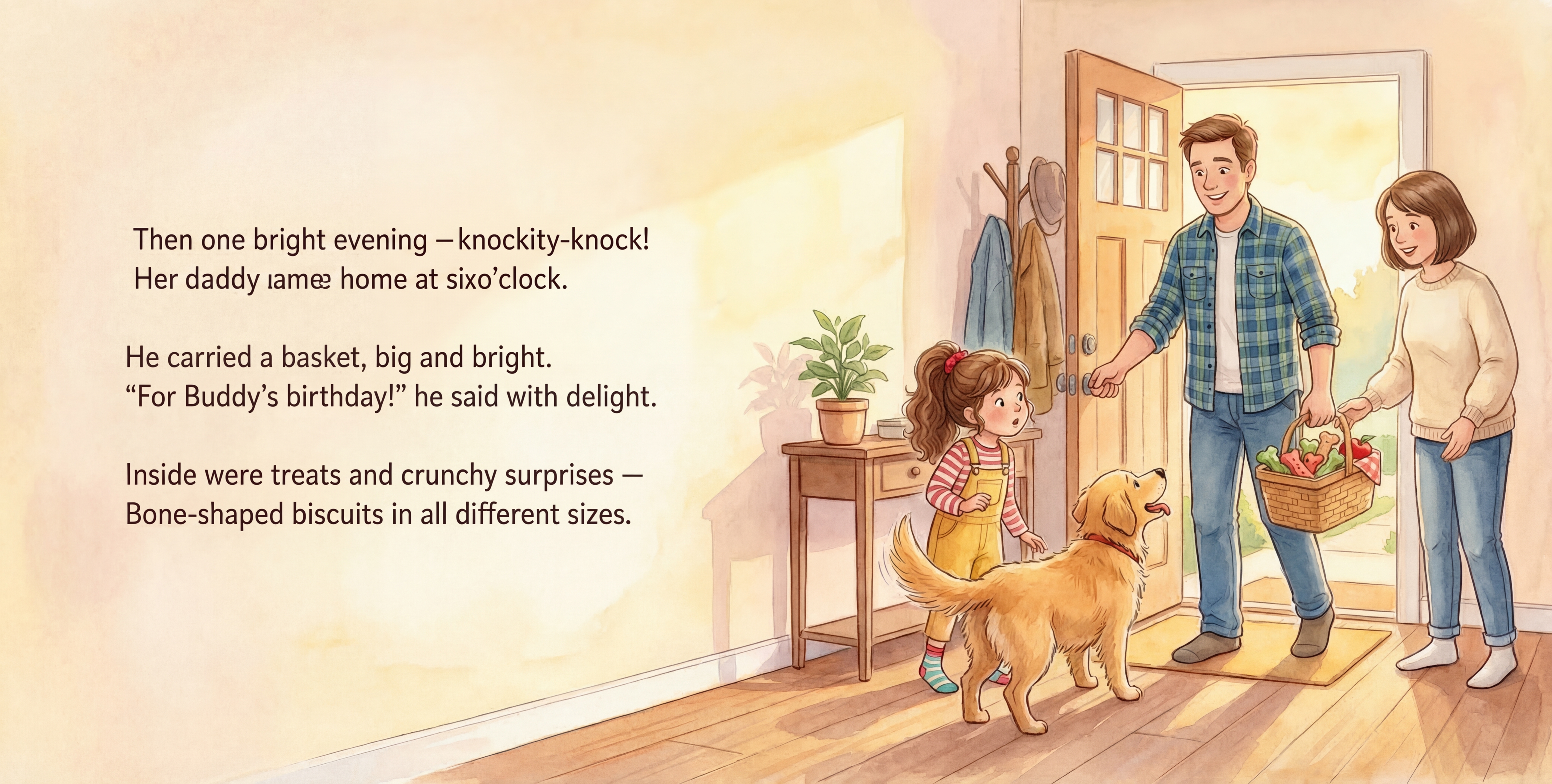 Buddy is Patty's loyal golden retriever and best friend. When he discovers a basket of crunchy, colorful surprises, his excitement is contagious! Buddy shows Patty that trying new things can be an adventure.
